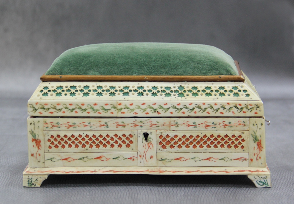Дерево, кость моржовая, кость животная, ткань, бумага, металл/ резьба прорезная (ажурная), резьба сквозная, гравировка цветная, оклейка, монтирование. 12х22х14 см.
