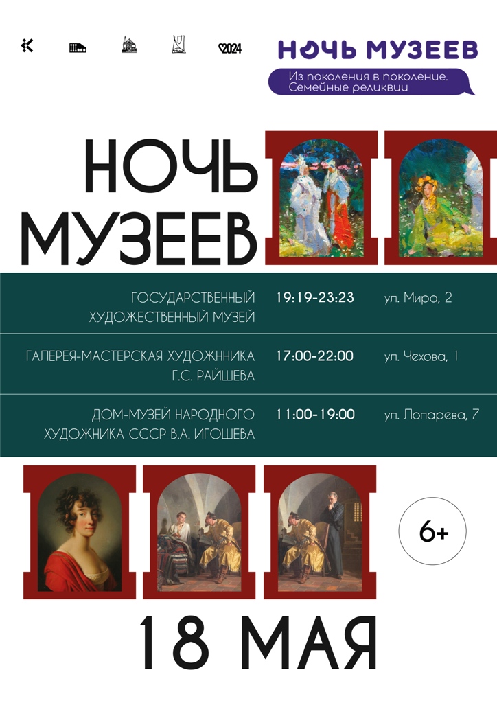 18 мая Государственный художественный музей Югры традиционно присоединяется к Всероссийской культурно-просветительской акции «Ночь в музее». Площадки акции будут открыты в главном здании ГХМ и во всех его филиалах. Все музейные активности будут связаны с Годом семьи, который объявлен в 2024 году.