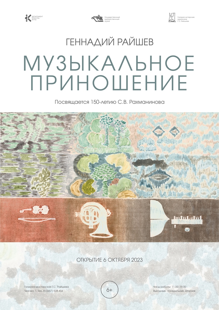 6 октября в 16.00. в Галерее-мастерской Г.С. Райшева, филиале Государственного художественного музея, состоится открытие выставки «Геннадий Райшев: Музыкальное приношение». Выставка в рамках проекта «Диалоги» посвящается 150-летию со дня рождения Сергея Васильевича Рахманинова.