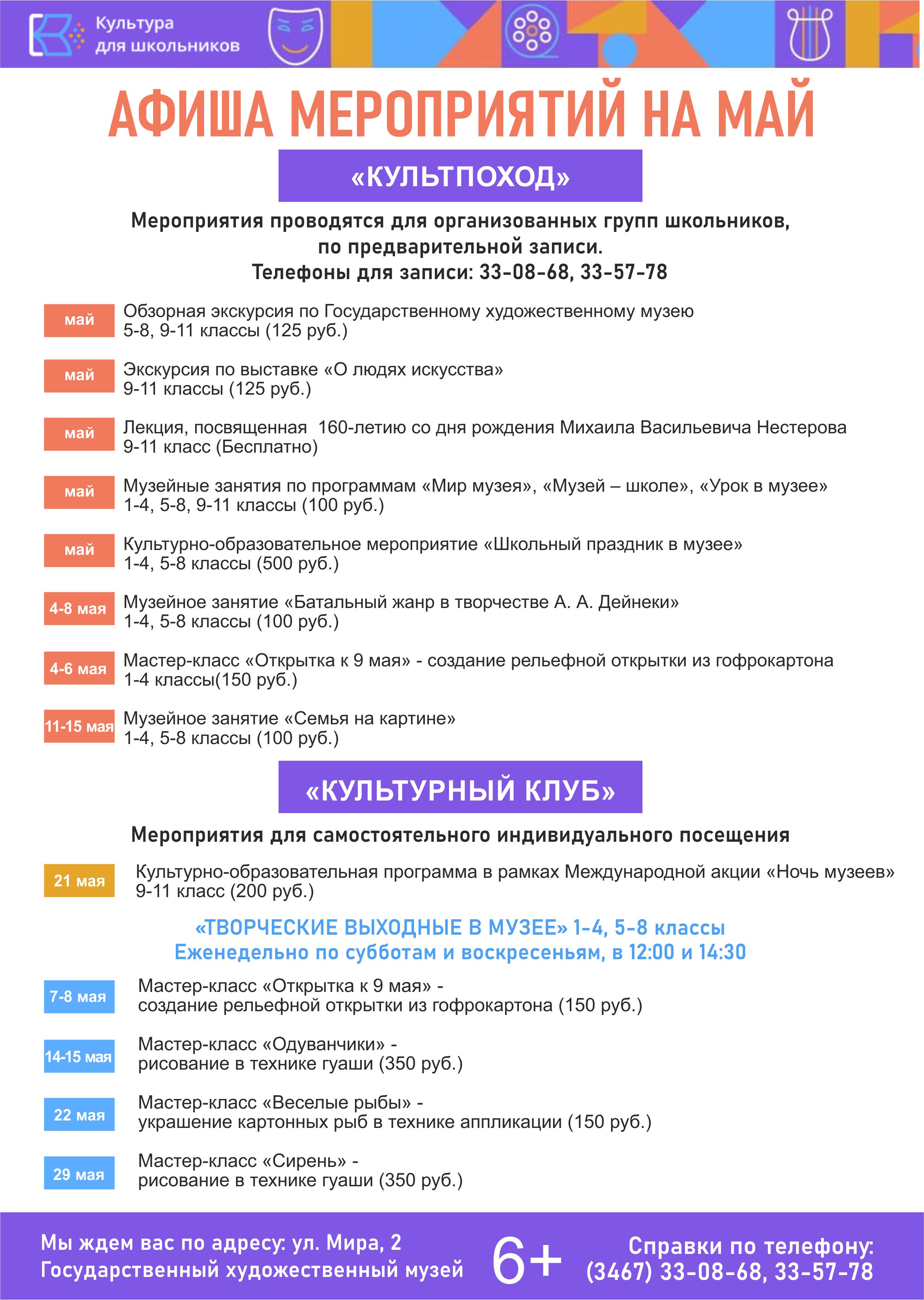 Приглашаем посетить мероприятия музея в рамках культурно-образовательного проекта «Культура для школьников». Межведомственный проект Министерства культуры и Министерства просвещения РФ направлен на духовное, эстетическое и художественное развитие школьников, повышение культурной грамотности подрастающего поколения.