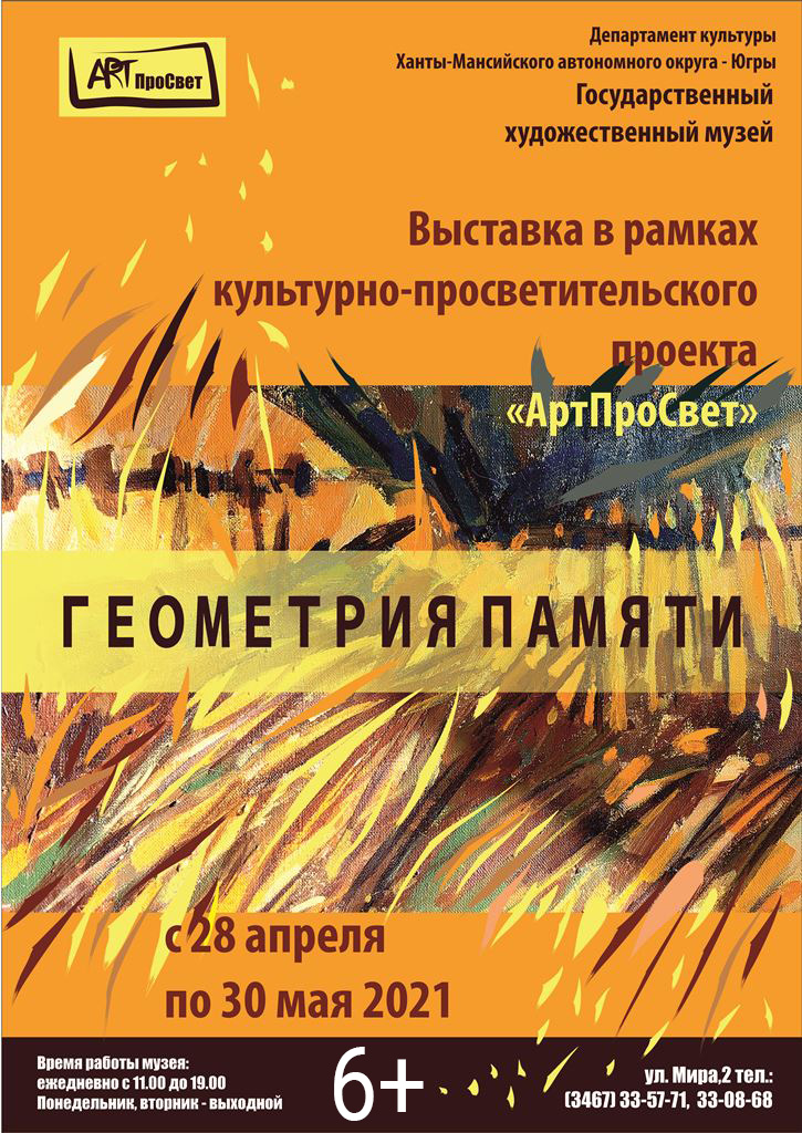 В Государственном художественном музее 28 апреля в рамках культурно-просветительского проекта «АртПроСвет» начнет свою работу выставка «Геометрия памяти». На выставке будут представлены избранные живописные и графические произведения ханты-мансийских художников Владислава Золотоверхого и Елизаветы Рябцевой, а также видео-арт Александра Седова (г. Лангепас).
