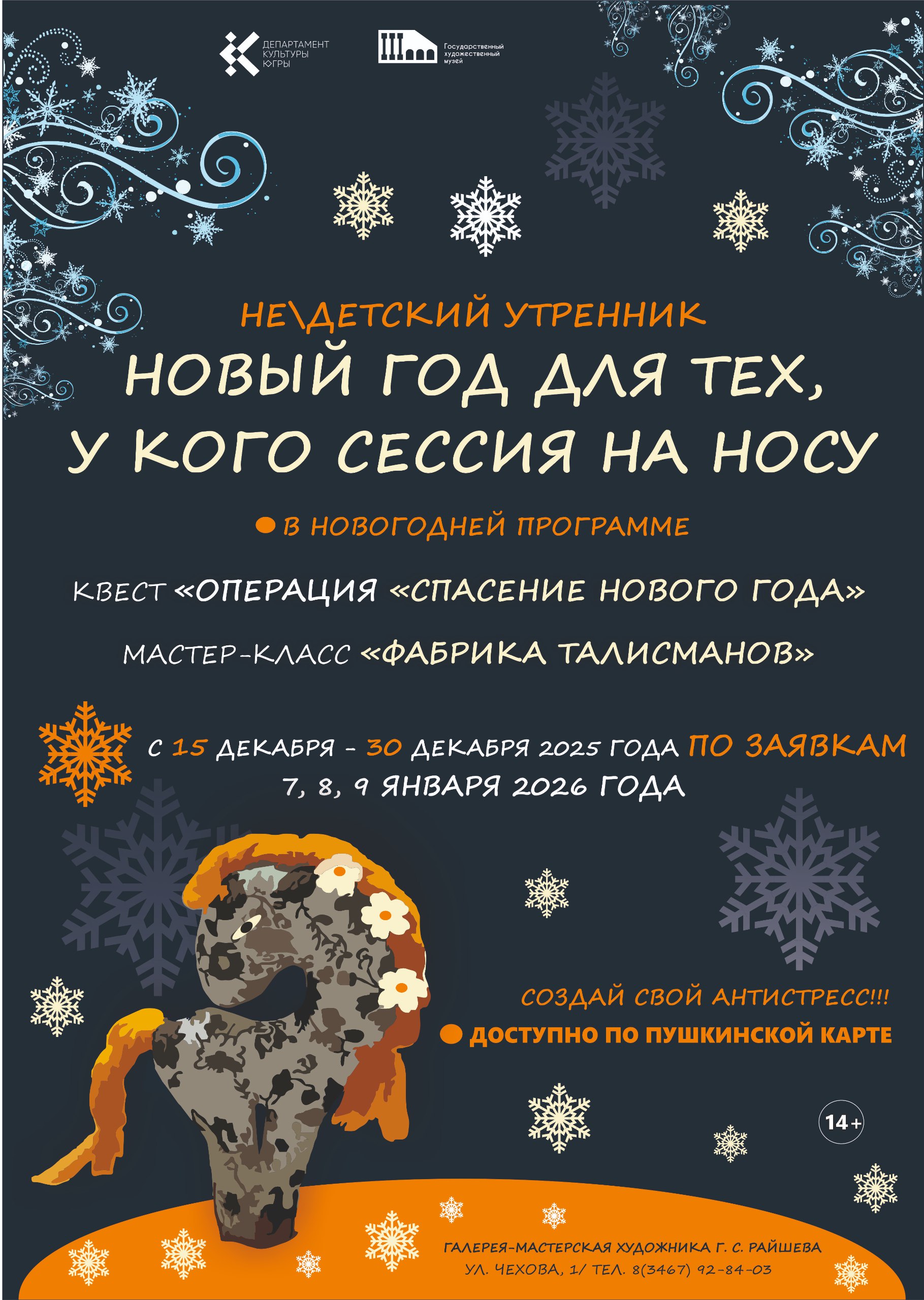 С 15 по 30 декабря 2025 года и с 7 по 9 января 2026 года Галерея-мастерская художника Г.С. Райшева приглашает студентов всех факультетов на уникальное мероприятие, призванное стать настоящим спасением от предсессионной хандры. Если вы чувствуете, что приближающаяся сессия грозит поглотить вас целиком, а мысли о билетах и экзаменах не дают покоя, то наш (Не)детский утренник «Новый год для тех, у кого сессия на носу» – это именно то, что вам нужно!