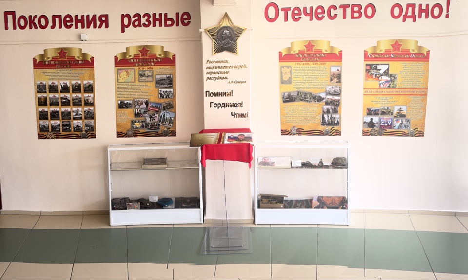 Представлена стендами с информацией о днях Воинской славы, событиях Афганской и Чеченской войны, СВО; документами, личными вещами участников локальных конфликтов и СВО.